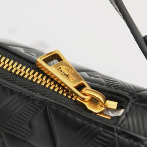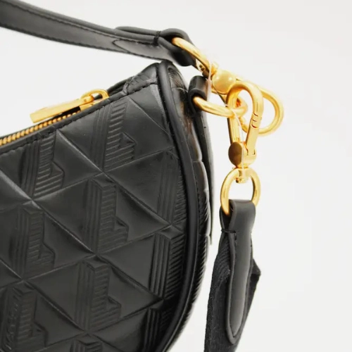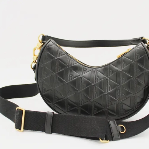 Bolso Lacoste con forma de media luna, cierre de cremallera, correa ajustable y herrajes dorados. Presenta diseño exterior en relieve en un único color.