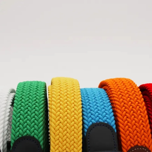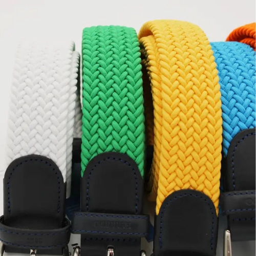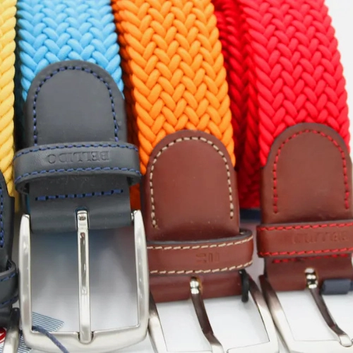 Cinturón trenzado con hebilla metálica de pasador y terminales en contraste. Diseño elástico con pasador fijo, disponible en diversos colores.