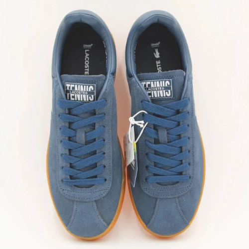 Tenis Lacoste de gamuza azul con suela naranja translúcida. Incluyen cierre de cordones y el logotipo en el lateral.